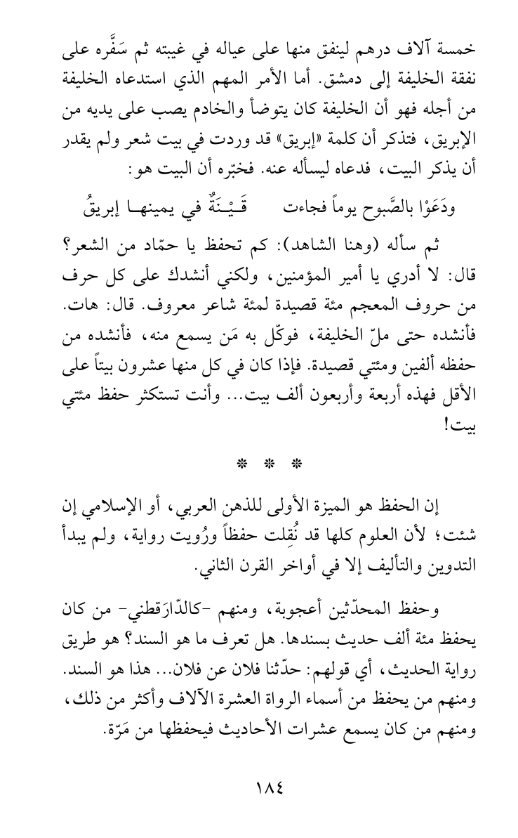 إن الحفظ هو الميزة الأولى للذهن العربي، أو الإسلامي إن شئت؛ لأن العلوم كلها قد نُقِلت حفظاً ورُويت رواية، ولم يبدأ التدوين والتأليف إلا في أواخر القرن الثاني.