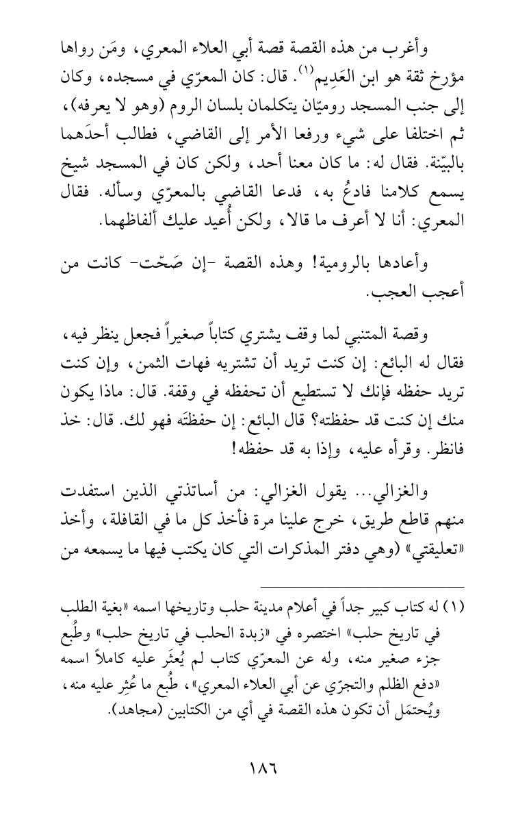 (¬1) له كتاب كبير جداً في أعلام مدينة حلب وتاريخها اسمه «بغية الطلب في تاريخ حلب» اختصره في «زبدة الحلب في تاريخ حلب» وطُبع جزء صغير منه، وله عن المعرّي كتاب لم يُعثَر عليه كاملاً اسمه «دفع الظلم والتجرّي عن أبي العلاء المعري»، طُبع ما عُثِر عليه منه، ويُحتمَل أن تكون هذه القصة في أي من الكتابين (مجاهد).
