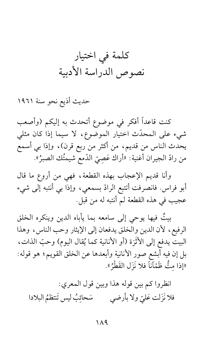 كنت قاعداً أفكر في موضوع أتحدث به إليكم (وأصعب شيء على المحدّث اختيار الموضوع، لا سيما إذا كان مثلي يحدث الناس من قديم، من أكثر من ربع قرن)، وإذا بي أسمع من رادّ الجيران أغنية: «أراك عَصِيّ الدّمع شيمتُك الصبرُ».