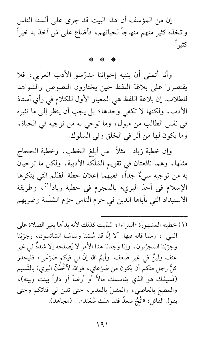 وأنا أتمنى أن ينتبه إخواننا مدرّسو الأدب العربي، فلا يقتصروا على بلاغة اللفظ حين يختارون النصوص والشواهد للطلاب. إن بلاغة اللفظ هي المعيار الأول للكلام في رأي أستاذ الأدب، ولكنها لا تكفي وحدها؛ بل يجب أن ينظر إلى ما تثيره في نفس الطالب من ميول، وما توحي به من توجيه في الحياة، وما يكون لها من أثر في الخلق وفي السلوك.