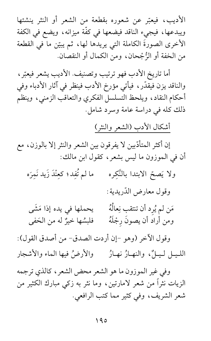 وفي غير الموزون ما هو الشعر محض الشعر، كالذي ترجمه الزيات نثراً من شعر لامارتين، وما نثر به زكي مبارك الكثير من شعر الشريف، وفي كثير مما كتب الرافعي.