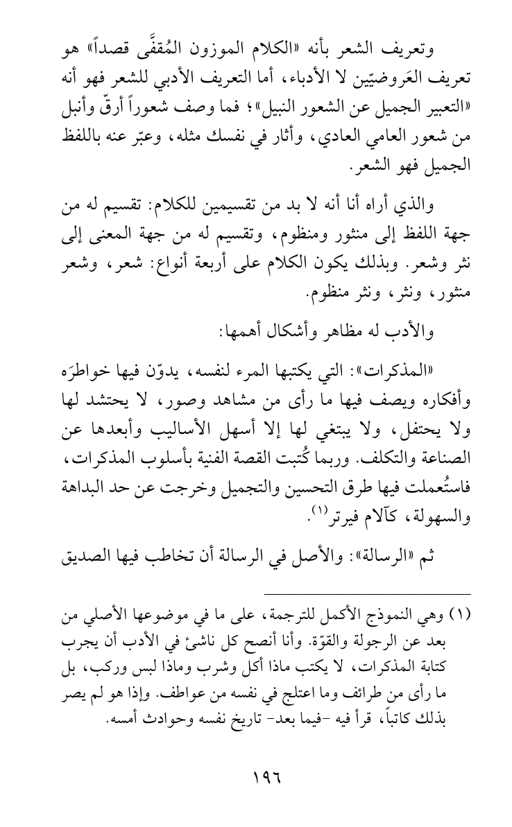 والذي أراه أنا أنه لا بد من تقسيمين للكلام: تقسيم له من جهة اللفظ إلى منثور ومنظوم، وتقسيم له من جهة المعنى إلى نثر وشعر. وبذلك يكون الكلام على أربعة أنواع: شعر، وشعر منثور، ونثر، ونثر منظوم.