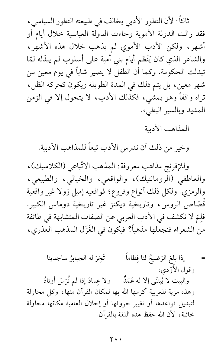 وللإفرنج مذاهب معروفة: المذهب الاتّباعي (الكلاسيك)، والعاطفي (الرومانتيك)، والواقعي، والخيالي، والطبيعي، والرمزي. ولكل ذلك أنواع وفروع؛ فواقعية إميل زولا غير واقعية قُصّاص الروس، وتاريخية ديكنز غير تاريخية دوماس الكبير. فلِمَ لا نكشف في الأدب العربي عن الصفات المتشابهة في طائفة من الشعراء فنجعلها مذهباً؟ فيكون في الغَزَل المذهب العذري،