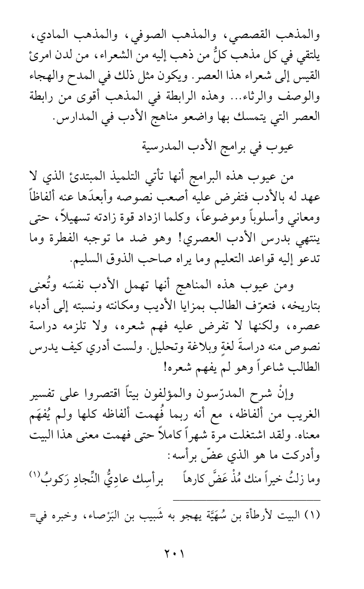 ومن عيوب هذه المناهج أنها تهمل الأدب نفسَه وتُعنى بتاريخه، فتعرّف الطالب بمزايا الأديب ومكانته ونسبته إلى أدباء عصره، ولكنها لا تفرض عليه فهم شعره، ولا تلزمه دراسة نصوص منه دراسةَ لغةٍ وبلاغة وتحليل. ولست أدري كيف يدرس الطالب شاعراً وهو لم يفهم شعره!