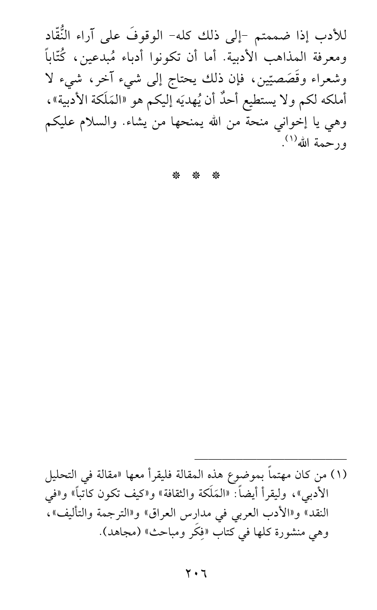 للأدب إذا ضممتم -إلى ذلك كله- الوقوفَ على آراء النُّقّاد ومعرفة المذاهب الأدبية. أما أن تكونوا أدباء مُبدعين، كُتّاباً وشعراء وقَصَصيّين، فإن ذلك يحتاج إلى شيء آخر، شيء لا أملكه لكم ولا يستطيع أحدٌ أن يُهديَه إليكم هو «المَلَكة الأدبية»، وهي يا إخواني منحة من الله يمنحها من يشاء. والسلام عليكم ورحمة الله (¬1).