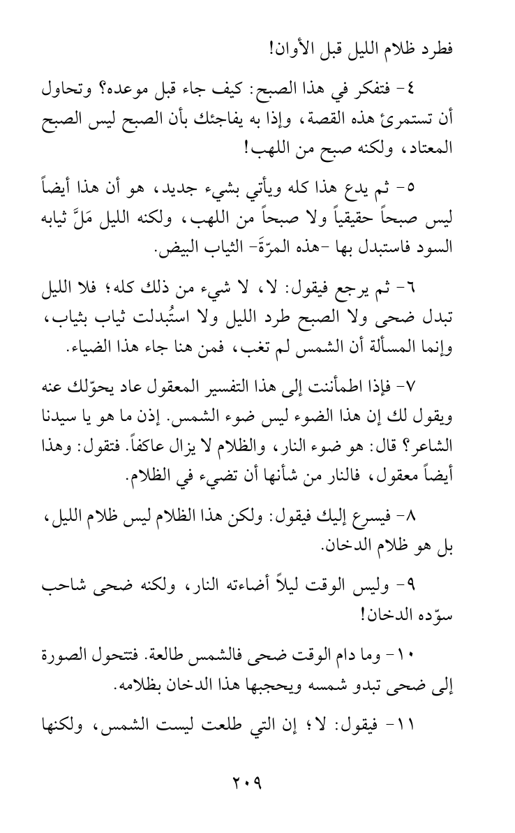 6 - ثم يرجع فيقول: لا، لا شيء من ذلك كله؛ فلا الليل تبدل ضحى ولا الصبح طرد الليل ولا استُبدلت ثياب بثياب، وإنما المسألة أن الشمس لم تغب، فمن هنا جاء هذا الضياء.