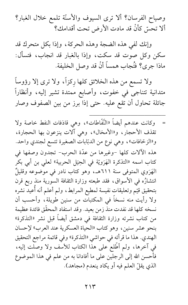 هذه الآلات كلها -وغيرها من عدّة الحرب- تجدون وصفها في كتاب اسمه «التذكرة الهَرَويّة في الحِيَل الحربية» لعلي بن أبي بكر الهَرَوي المتوفى سنة 611هـ، وهو كتاب نادر في موضوعه وقليلٌ انتشارُه في الأسواق، فقد طبعته وزارة الثقافة السورية منذ ربع قرن بتحقيق قيّم وتعليقات نفيسة لمطيع المرابط، ولم أعلم أنه أُعيد نشره ولا رأيت منه نسخاً في المكتبات من سنين طويلة، وأحسب أن نسخه كلها قد نفدت منذ زمن بعيد. وقد استفاد المحقّق فائدة عظيمة من كتاب نشرته وزارة الثقافة في دمشق أيضاً قبل نشر «التذكرة» بنحو عشر سنين، وهو كتاب «الحياة العسكرية عند العرب» لإحسان الهندي. هذا ما قرأته في حواشي «التذكرة» وفي قائمة مراجع التحقيق في آخرها، ولم أطّلع على هذا الكتاب للأسف ولا وصلت إليه، فأحسن الله إلى الرجلين على ما أفادانا به من علم في هذا الموضوع الذي يقلّ العلم فيه أو يكاد ينعدم (مجاهد).