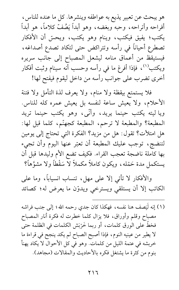 (¬1) إنه لَيَصف هنا نفسه، فهكذا كان جدي رحمه الله؛ إلى جنب فراشه مصباح وقلم وأوراق، فلا يزال كلما خطرت له فكرة أنار المصباح فخطّ على الورق كلمات، أو ربما خَرْبَش الكلمات في الظلمة حتى لا يطير من عينيه النوم، فإذا أصبح الصباح لم يكد ينجح في قراءة ما خربشه في عتمة الليل من كلمات. وهو في كل الأحوال لا يكاد يهنأ بنوم من كثرة ما يشتغل فكره بالأحاديث والمقالات (مجاهد).