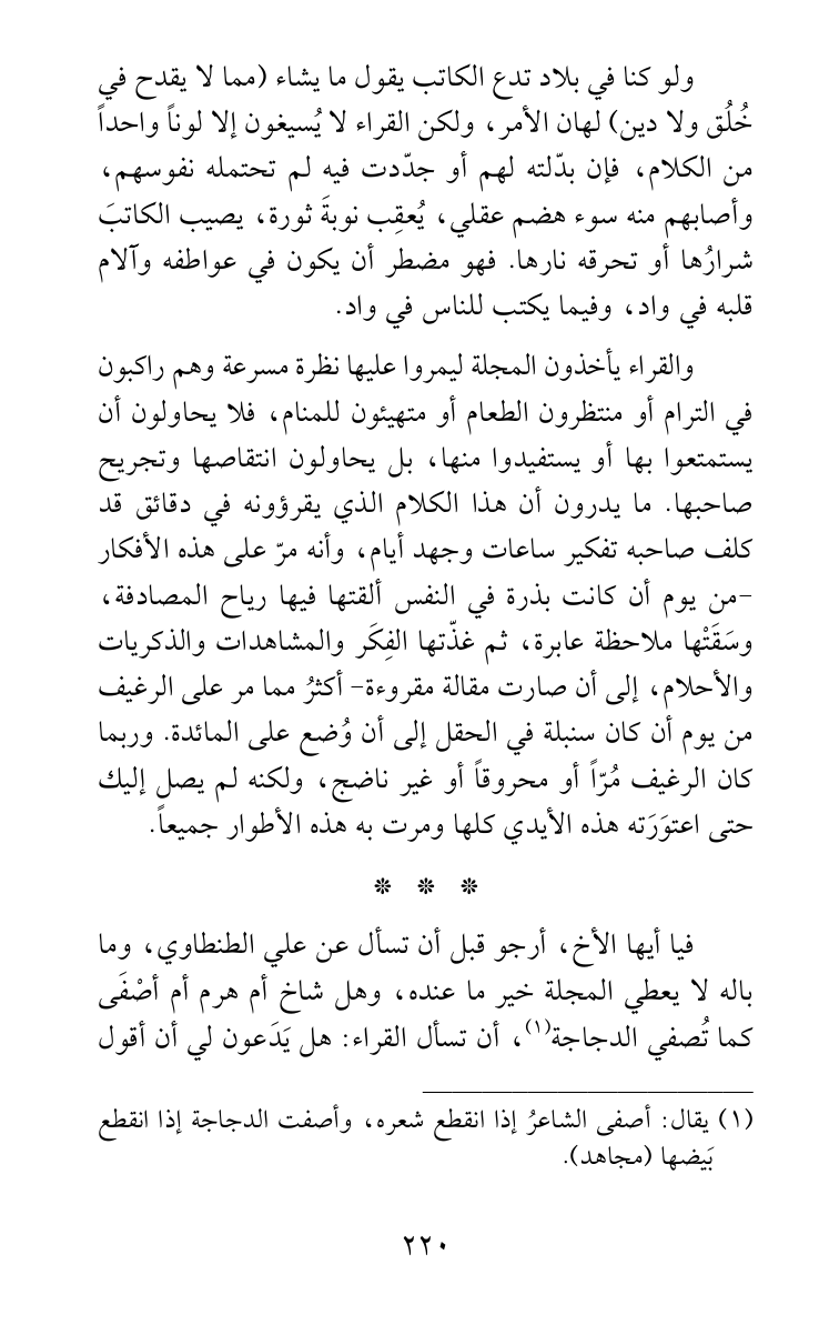 فيا أيها الأخ، أرجو قبل أن تسأل عن علي الطنطاوي، وما باله لا يعطي المجلة خير ما عنده، وهل شاخ أم هرم أم أصْفَى كما تُصفي الدجاجة (¬1)، أن تسأل القراء: هل يَدَعون لي أن أقول