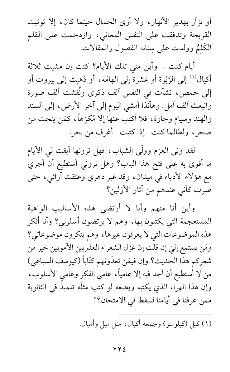 وأين أنا منهم وأنا لا أرتضي هذه الأساليب الواهية المستعجمة التي يكتبون بها، وهم لا يرتضون أسلوبي؟ وأنا أنكر هذه الموضوعات التي لا يعرفون غيرها، وهم ينكرون موضوعاتي؟ ومَن يستمع إليّ إن قلت إن غزل الشعراء العذريين الأمويين خير من شعركم هذا الحديث؟ وإن فيمَن تعدّونهم كتّاباً (كيوسف السباعي) من لا أستطيع أن أجد فيه إلا عامياً، عامي الفكر وعامي الأسلوب، وإن هذا الهراء الذي يكتبه ويطبعه لو كتب مثلَه تلميذٌ في الثانوية ممن عرفنا في أيامنا لسقط في الامتحان؟!