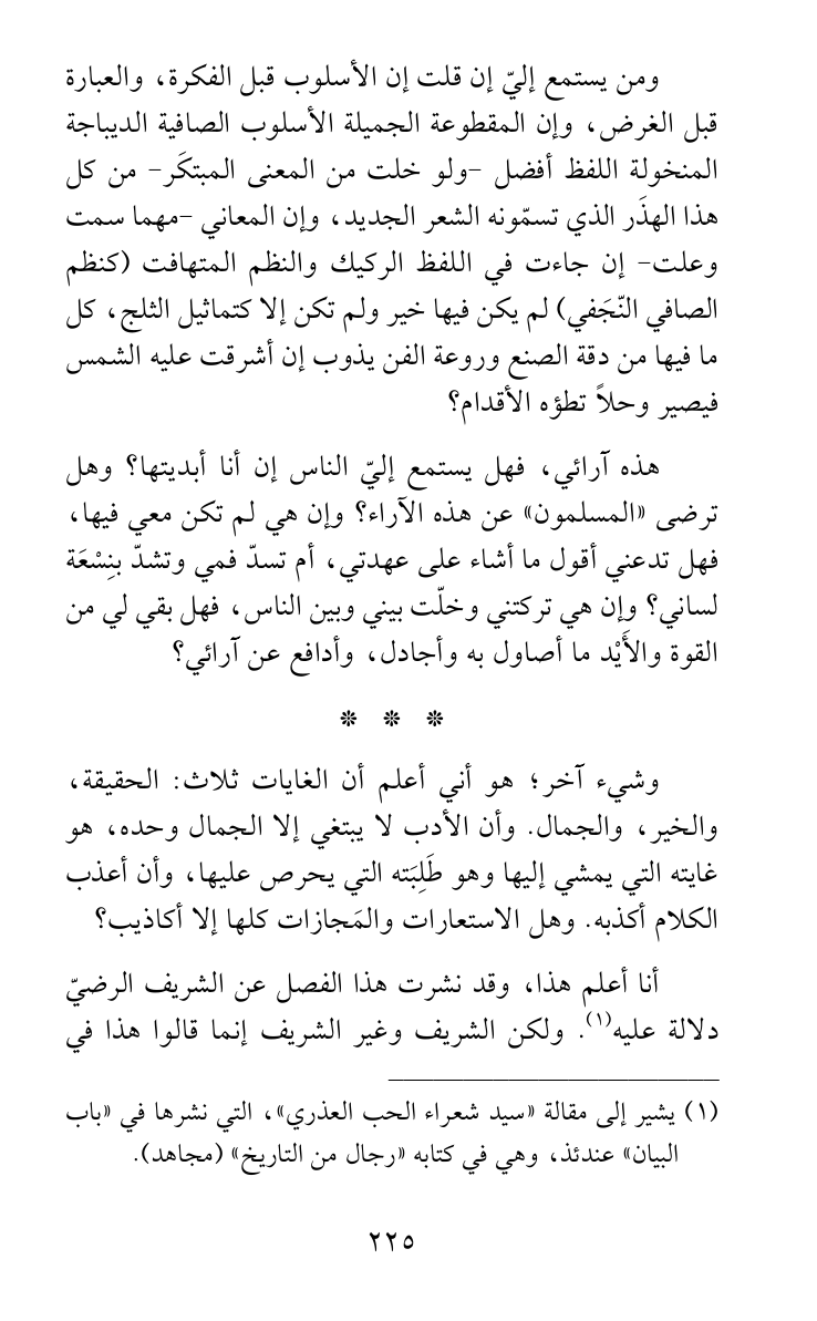 ومن يستمع إليّ إن قلت إن الأسلوب قبل الفكرة، والعبارة قبل الغرض، وإن المقطوعة الجميلة الأسلوب الصافية الديباجة المنخولة اللفظ أفضل -ولو خلت من المعنى المبتكَر- من كل هذا الهذَر الذي تسمّونه الشعر الجديد، وإن المعاني -مهما سمت وعلت- إن جاءت في اللفظ الركيك والنظم المتهافت (كنظم الصافي النّجَفي) لم يكن فيها خير ولم تكن إلا كتماثيل الثلج، كل ما فيها من دقة الصنع وروعة الفن يذوب إن أشرقت عليه الشمس فيصير وحلاً تطؤه الأقدام؟