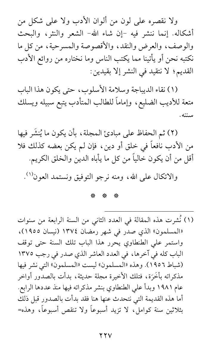 (2) ثم الحفاظ على مبادئ المجلة، بأن يكون ما يُنشَر فيها من الأدب نافعاً في خلق أو دين، فإن لم يكن بعضه كذلك فلا أقل من أن يكون خالياً من كل ما يأباه الدين والخلق الكريم.