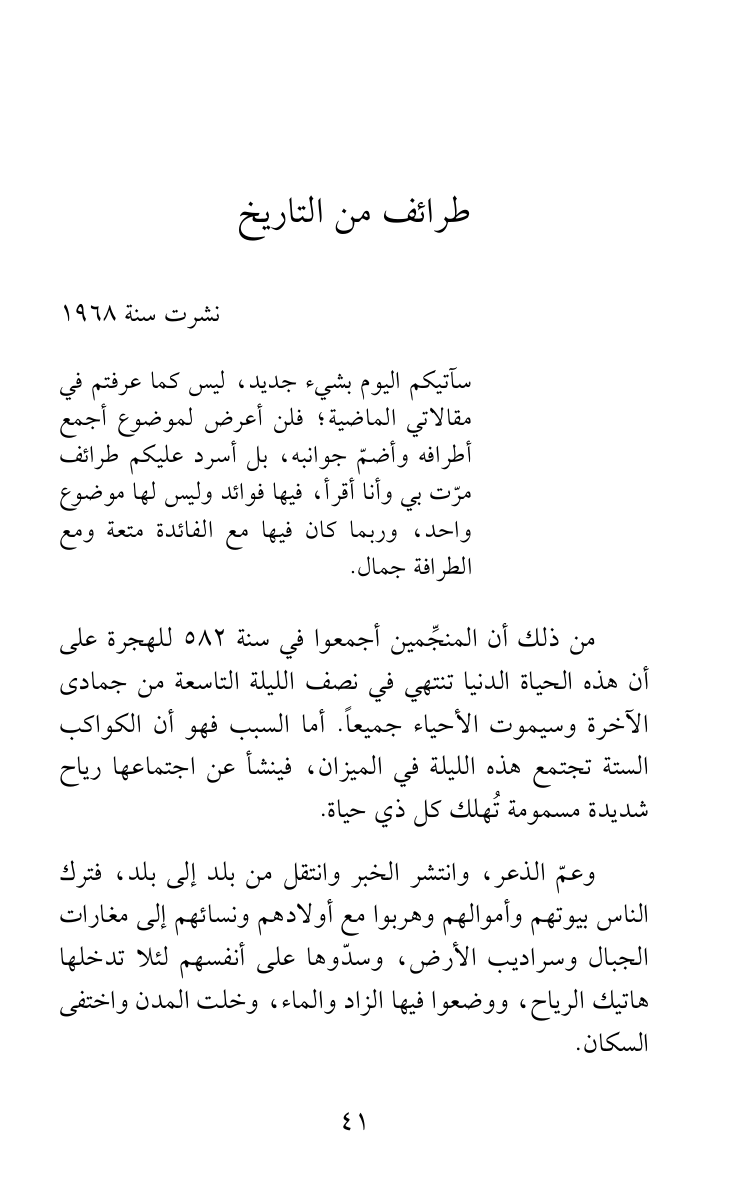 [سآتيكم اليوم بشيء جديد، ليس كما عرفتم في مقالاتي الماضية؛ فلن أعرض لموضوع أجمع أطرافه وأضمّ جوانبه، بل أسرد عليكم طرائف مرّت بي وأنا أقرأ، فيها فوائد وليس لها موضوع واحد، وربما كان فيها مع الفائدة متعة ومع الطرافة جمال.]