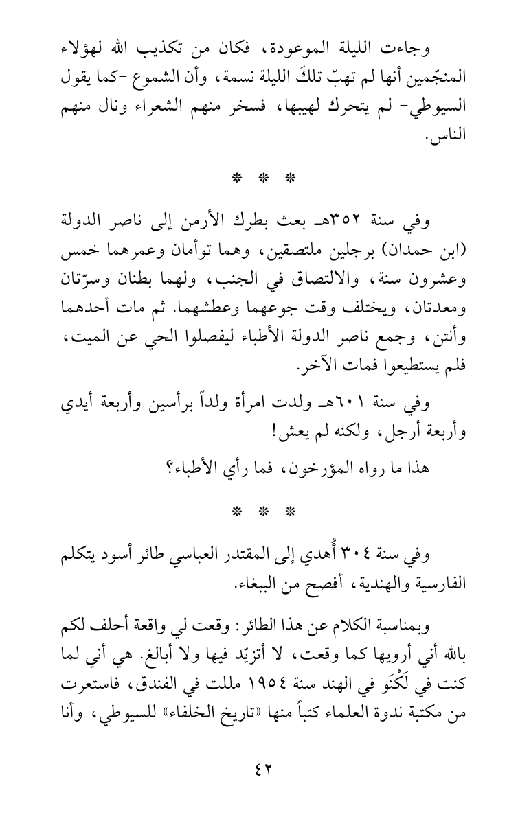 وبمناسبة الكلام عن هذا الطائر: وقعت لي واقعة أحلف لكم بالله أني أرويها كما وقعت، لا أتزيّد فيها ولا أبالغ. هي أني لما كنت في لَكْنَو في الهند سنة 1954 مللت في الفندق، فاستعرت من مكتبة ندوة العلماء كتباً منها «تاريخ الخلفاء» للسيوطي، وأنا
