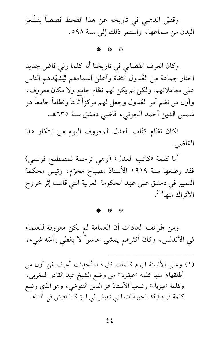 (¬1) وعلى الألسنة اليوم كلمات كثيرة استُحدِثت أعرف مَن أول من أطلقها؛ منها كلمة «عبقرية» من وضع الشيخ عبد القادر المغربي، وكلمة «فيزياء» وضعها الأستاذ عز الدين التنوخي، وهو الذي وضع كلمة «برمائية» للحيوانات التي تعيش في البرّ كما تعيش في الماء.
