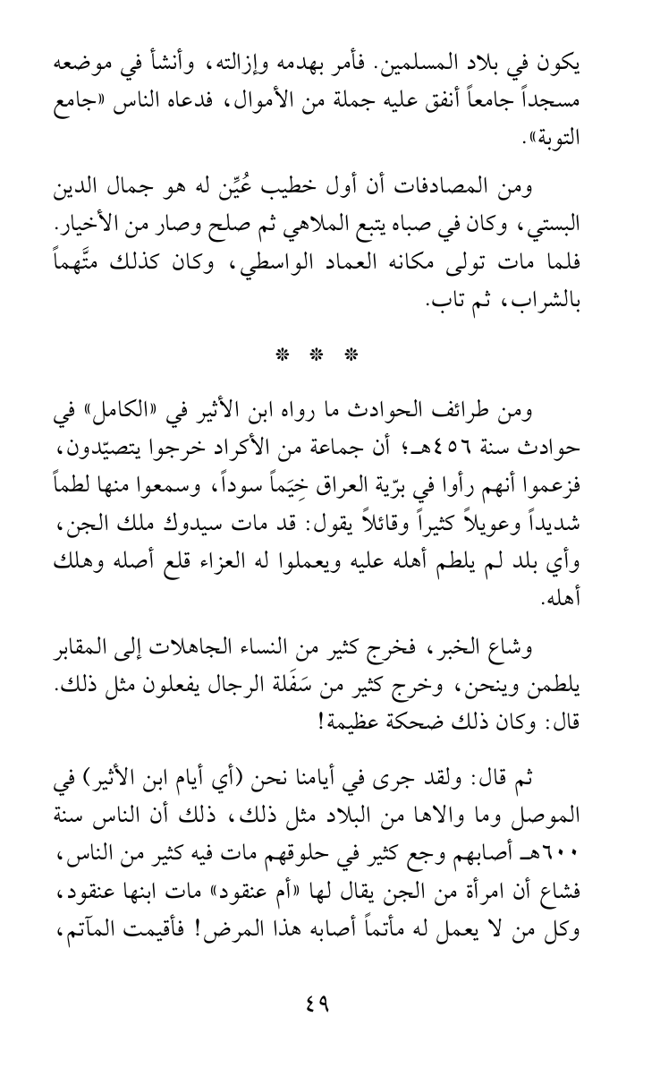 ومن طرائف الحوادث ما رواه ابن الأثير في «الكامل» في حوادث سنة 456هـ؛ أن جماعة من الأكراد خرجوا يتصيّدون، فزعموا أنهم رأوا في برّية العراق خِيَماً سوداً، وسمعوا منها لطماً شديداً وعويلاً كثيراً وقائلاً يقول: قد مات سيدوك ملك الجن، وأي بلد لم يلطم أهله عليه ويعملوا له العزاء قلع أصله وهلك أهله.