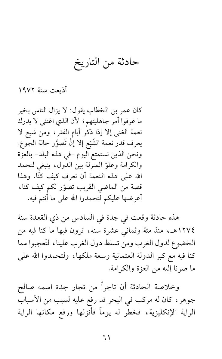 هذه حادثة وقعت في جدة في السادس من ذي القعدة سنة 1274هـ، منذ مئة وثماني عشرة سنة، ترون فيها ما كنا فيه من الخضوع لدول الغرب ومن تسلط دول الغرب علينا، لتَعجبوا مما كنا فيه مع كبر الدولة العثمانية وسعة ملكها، ولتحمدوا الله على ما صرنا إليه من العزة والكرامة.