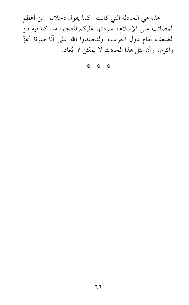 هذه هي الحادثة التي كانت -كما يقول دحلان- من أعظم المصائب على الإسلام، سردتها عليكم لتَعجبوا مما كنا فيه من الضعف أمام دول الغرب، ولتحمدوا الله على أنّا صرنا أعزّ وأكرم، وأن مثل هذا الحادث لا يمكن أن يُعاد.