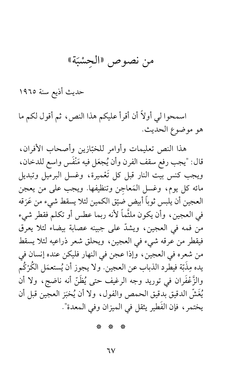هذا النص تعليمات وأوامر للخبّازين وأصحاب الأفران، قال: "يجب رفع سقف الفرن وأن يُجعَل فيه مَنْفَس واسع للدخان، ويجب كنس بيت النار قبل كل تَعْميرة، وغسل البرميل وتبديل مائه كل يوم، وغسل المَعاجِن وتنظيفها. ويجب على من يعجن العجين أن يلبس ثوباً أبيض ضيّق الكمين لئلا يسقط شيء من عَرَقه في العجين، وأن يكون ملثَّماً لأنه ربما عطس أو تكلم فقطر شيء من فمه في العجين، ويشدّ على جبينه عصابة بيضاء لئلا يعرق فيقطر من عرقه شيء في العجين، ويحلق شعر ذراعيه لئلا يسقط من شعره في العجين، وإذا عجن في النهار فليكن عنده إنسان في يده مِذَبّة فيطرد الذباب عن العجين. ولا يجوز أن يُستعمَل الكُرْكُم والزَّعْفَران في توريد وجه الرغيف حتى يُظَنّ أنه ناضج، ولا أن يُغَشّ الدقيق بدقيق الحمص والفول، ولا أن يُخبَز العجين قبل أن يختمر، فإن الفَطير يثقل في الميزان وفي المعدة".
