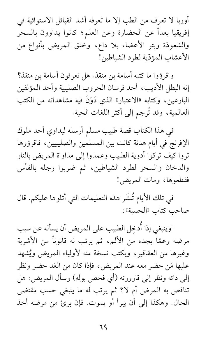 في هذا الكتاب قصة طبيب مسلم أرسله ليداوي أحد ملوك الإفرنج في أيام هدنة كانت بين المسلمين والصليبيين، فاقرؤوها تروا كيف تركوا أدوية الطبيب وعمدوا إلى مداواة المريض بالنار والدخان والسحر لطرد الشياطين، ثم ضربوا رجله بالفأس فقطعوها، ومات المريض!