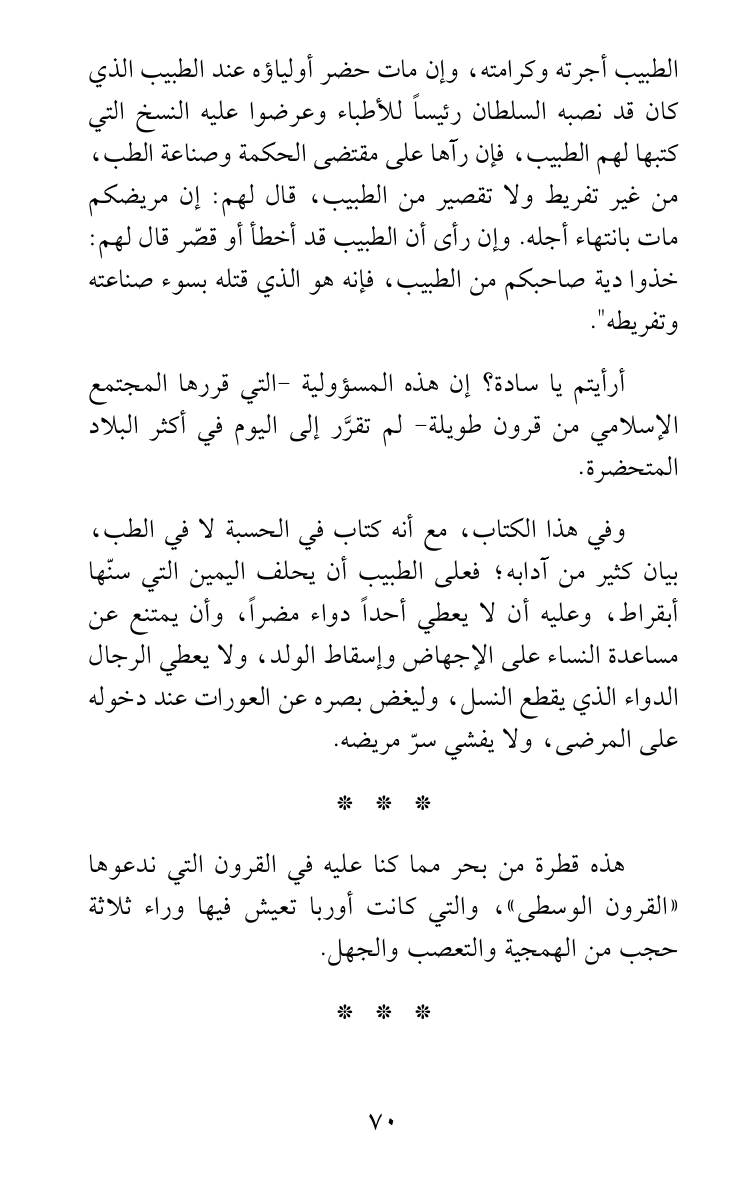 الطبيب أجرته وكرامته، وإن مات حضر أولياؤه عند الطبيب الذي كان قد نصبه السلطان رئيساً للأطباء وعرضوا عليه النسخ التي كتبها لهم الطبيب، فإن رآها على مقتضى الحكمة وصناعة الطب، من غير تفريط ولا تقصير من الطبيب، قال لهم: إن مريضكم مات بانتهاء أجله. وإن رأى أن الطبيب قد أخطأ أو قصّر قال لهم: خذوا دية صاحبكم من الطبيب، فإنه هو الذي قتله بسوء صناعته وتفريطه".