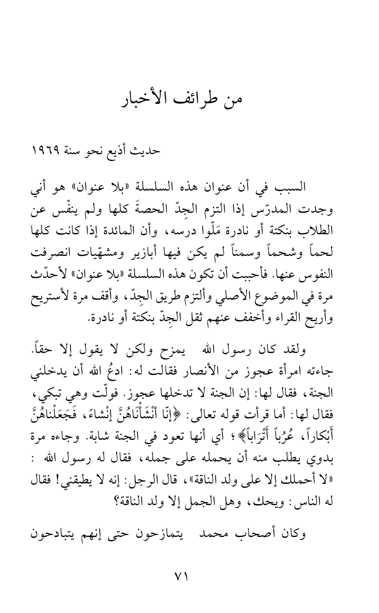السبب في أن عنوان هذه السلسلة «بلا عنوان» هو أني وجدت المدرّس إذا التزم الجِدّ الحصةَ كلها ولم ينفّس عن الطلاب بنكتة أو نادرة مَلّوا درسه، وأن المائدة إذا كانت كلها لحماً وشحماً وسمناً لم يكن فيها أبازير ومشهّيات انصرفت النفوس عنها. فأحببت أن تكون هذه السلسلة «بلا عنوان» لأحدّث مرة في الموضوع الأصلي وألتزم طريق الجِدّ، وأقف مرة لأستريح وأريح القراء وأخفف عنهم ثقل الجِدّ بنكتة أو نادرة.