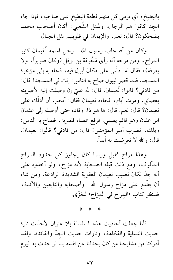 وهذا مزاح ثقيل وربما كان يجاوز كل حدود المزاح المألوف، ومع ذلك قبله الصحابة لأنه مزاح، ولو أخذوه على أنه جِدّ لكان نصيب نعيمان العقوبة الشديدة الرادعة. ومن شاء أن يطّلع على مزاح رسول الله صلى الله عليه وسلم وأصحابه والتابعين والأئمة، فلينظر كتاب «المِراح في المِزاح» للغَزّي.