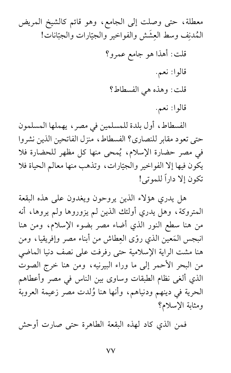 هل يدري هؤلاء الذين يروحون ويغدون على هذه البقعة المتروكة، وهل يدري أولئك الذين لم يزوروها ولم يروها، أنه من هنا سطع النور الذي أضاء مصر بضوء الإسلام، ومن هنا انبجس المَعين الذي روّى العِطاش من أبناء مصر وإفريقيا، ومن هنا مشت الراية الإسلامية حتى رفرفت على نصف دنيا الماضي من البحر الأحمر إلى ما وراء البيرنيه، ومن هنا خرج الصوت الذي ألغى نظام الطبقات وساوى بين الناس في مصر وأعطاهم الحرية في دينهم ودنياهم، وأنها هنا وُلدت مصر زعيمة العروبة ومثابة الإسلام؟