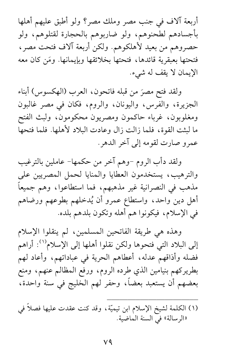 ولقد فتح مصرَ من قبله فاتحون، العرب (الهكسوس) أبناء الجزيرة، والفرس، واليونان، والروم، فكان في مصر غالبون ومغلوبون، غرباء حاكمون ومصريون محكومون، ولبث الفتح ما لبثت القوة، فلما زالت زال وعادت البلاد لأهلها. فلما فتحها عمرو صارت لقومه إلى آخر الدهر.