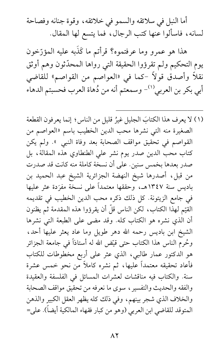 (¬1) لا يعرف هذا الكتابَ الجليل غيرُ قليل من الناس؛ إنما يعرفون القطعة الصغيرة منه التي نشرها محب الدين الخطيب باسم «العواصم من القواصم في تحقيق مواقف الصحابة بعد وفاة النبي صلى الله عليه وسلم». ولم يكن كتاب محب الدين صدر يوم نشر علي الطنطاوي هذه المقالة، بل صدر بعدها بخمس سنين. على أن نسخة كاملة منه كانت قد صدرت من قبل، أصدرها شيخ النهضة الجزائرية الشيخ عبد الحميد بن باديس سنة 1347هـ، وحققها معتمداً على نسخة مفرَدة عثر عليها في جامع الزيتونة. كل ذلك ذكره محب الدين الخطيب في تقديمه القيّم لهذا الكتاب، لكن الناس قلّ أن يقرؤوا هذه المقدمة ثم يظنون أن الذي نشره هو الكتاب كله. وقد مضى على الطبعة التي نشرها الشيخ ابن باديس رحمه الله دهر طويل وما عاد يعثر عليها أحد، وحُرم الناس هذا الكتاب حتى قيّض الله له أستاذاً في جامعة الجزائر هو الدكتور عمار طالبي، الذي عثر على أربع مخطوطات للكتاب فأعاد تحقيقه معتمداً عليها، ثم نشره كاملاً من نحو خمس عشرة سنة. والكتاب فيه مناقشات لعشرات المسائل في الفلسفة والعقيدة والفقه والحديث والتفسير، سوى ما نعرفه من تحقيق مواقف الصحابة والخلاف الذي شجر بينهم، وفي ذلك كله يظهر العقل الكبير والذهن المتوقد للقاضي ابن العربي (وهو من كبار فقهاء المالكية أيضاً). على=