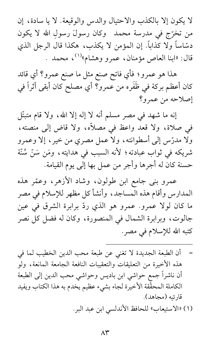عمرو بنى جامع ابن طولون، وشاد الأزهر، وعمّر هذه المدارس وأقام هذه المساجد، وأنشأ كل مظهر للإسلام في مصر ما كان لولا عمرو. عمرو هو الذي ردّ برابرة الشرق في عين جالوت، وبرابرة الشمال في المنصورة، وكان له فضل كل نصر كتبه الله للإسلام في مصر.