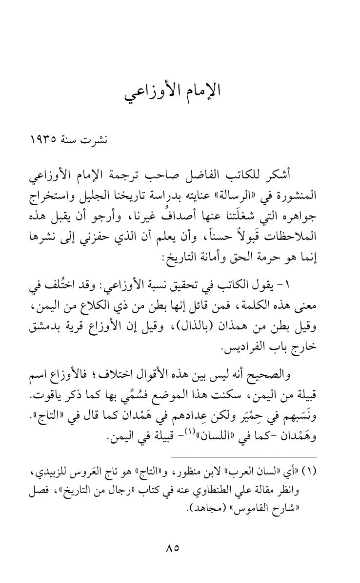 1 - يقول الكاتب في تحقيق نسبة الأوزاعي: وقد اختُلف في معنى هذه الكلمة، فمن قائل إنها بطن من ذي الكلاع من اليمن، وقيل بطن من همذان (بالذال)، وقيل إن الأوزاع قرية بدمشق خارج باب الفراديس.