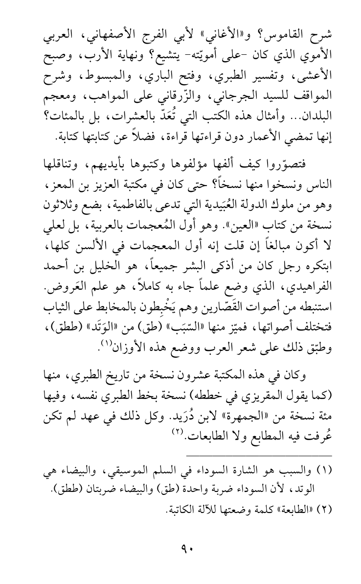 شرح القاموس؟ و «الأغاني» لأبي الفرج الأصفهاني، العربي الأموي الذي كان -على أمويّته- يتشيع؟ ونهاية الأرب، وصبح الأعشى، وتفسير الطبري، وفتح الباري، والمبسوط، وشرح المواقف للسيد الجرجاني، والزّرقاني على المواهب، ومعجم البلدان ... وأمثال هذه الكتب التي تُعَدّ بالعشرات، بل بالمئات؟ إنها تمضي الأعمار دون قراءتها قراءة، فضلاً عن كتابتها كتابة.