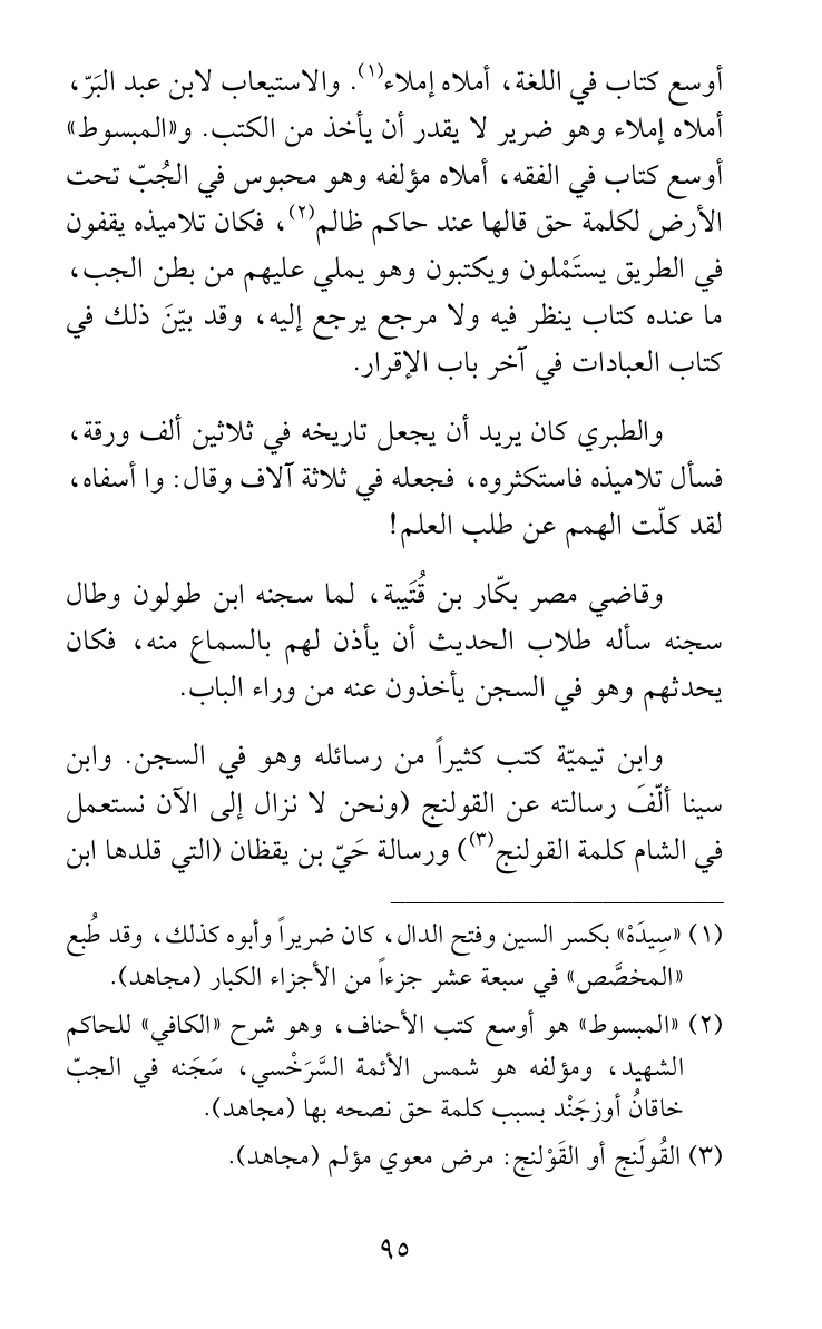 أوسع كتاب في اللغة، أملاه إملاء (¬1). والاستيعاب لابن عبد البَرّ، أملاه إملاء وهو ضرير لا يقدر أن يأخذ من الكتب. و «المبسوط» أوسع كتاب في الفقه، أملاه مؤلفه وهو محبوس في الجُبّ تحت الأرض لكلمة حق قالها عند حاكم ظالم (¬2)، فكان تلاميذه يقفون في الطريق يستَمْلون ويكتبون وهو يملي عليهم من بطن الجب، ما عنده كتاب ينظر فيه ولا مرجع يرجع إليه، وقد بيّنَ ذلك في كتاب العبادات في آخر باب الإقرار.