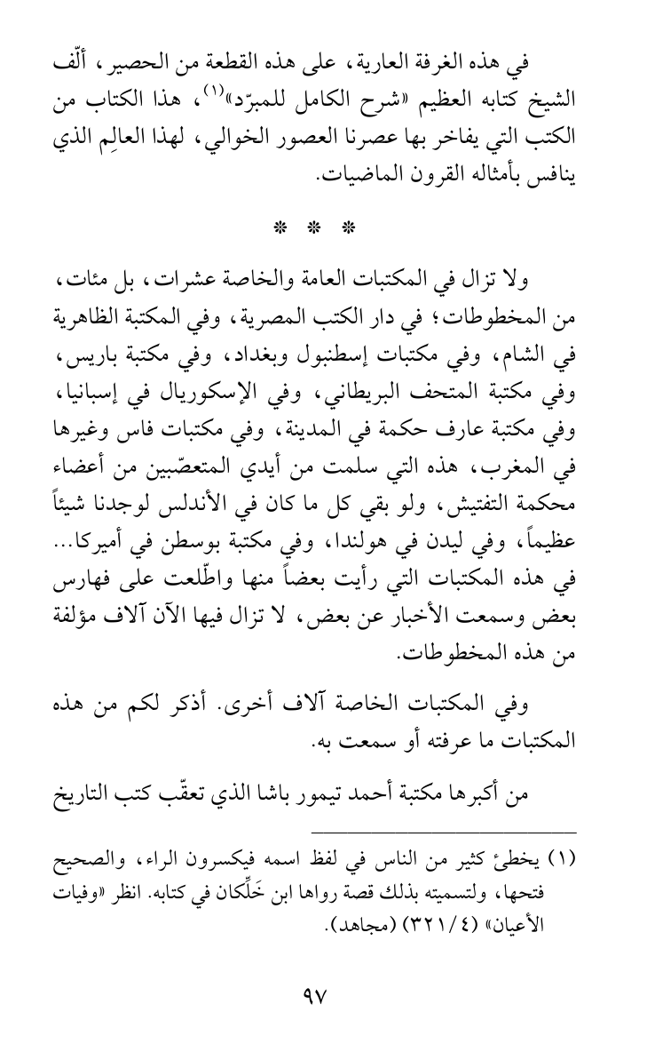 في هذه الغرفة العارية، على هذه القطعة من الحصير، ألّف الشيخ كتابه العظيم «شرح الكامل للمبرّد» (¬1)، هذا الكتاب من الكتب التي يفاخر بها عصرنا العصور الخوالي، لهذا العالِم الذي ينافس بأمثاله القرون الماضيات.