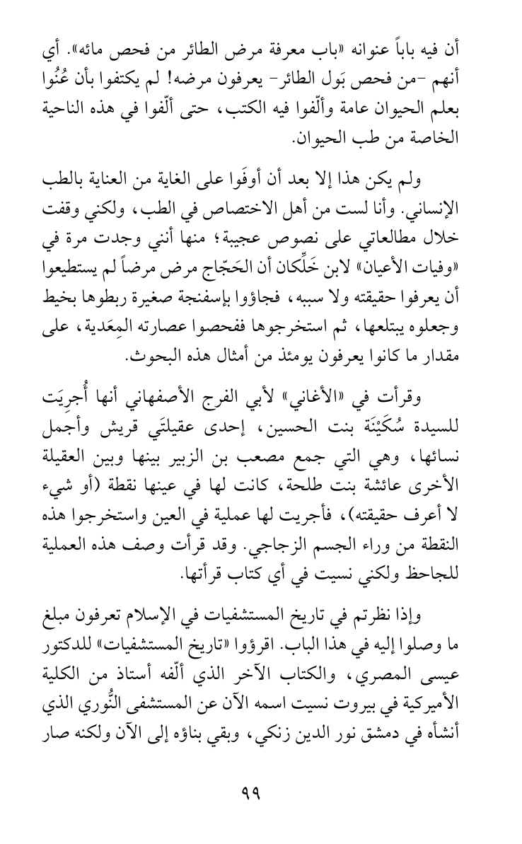 ولم يكن هذا إلا بعد أن أوفَوا على الغاية من العناية بالطب الإنساني. وأنا لست من أهل الاختصاص في الطب، ولكني وقفت خلال مطالعاتي على نصوص عجيبة؛ منها أنني وجدت مرة في «وفيات الأعيان» لابن خَلِّكان أن الحَجّاج مرض مرضاً لم يستطيعوا أن يعرفوا حقيقته ولا سببه، فجاؤوا بإسفنجة صغيرة ربطوها بخيط وجعلوه يبتلعها، ثم استخرجوها ففحصوا عصارته المِعَدية، على مقدار ما كانوا يعرفون يومئذ من أمثال هذه البحوث.