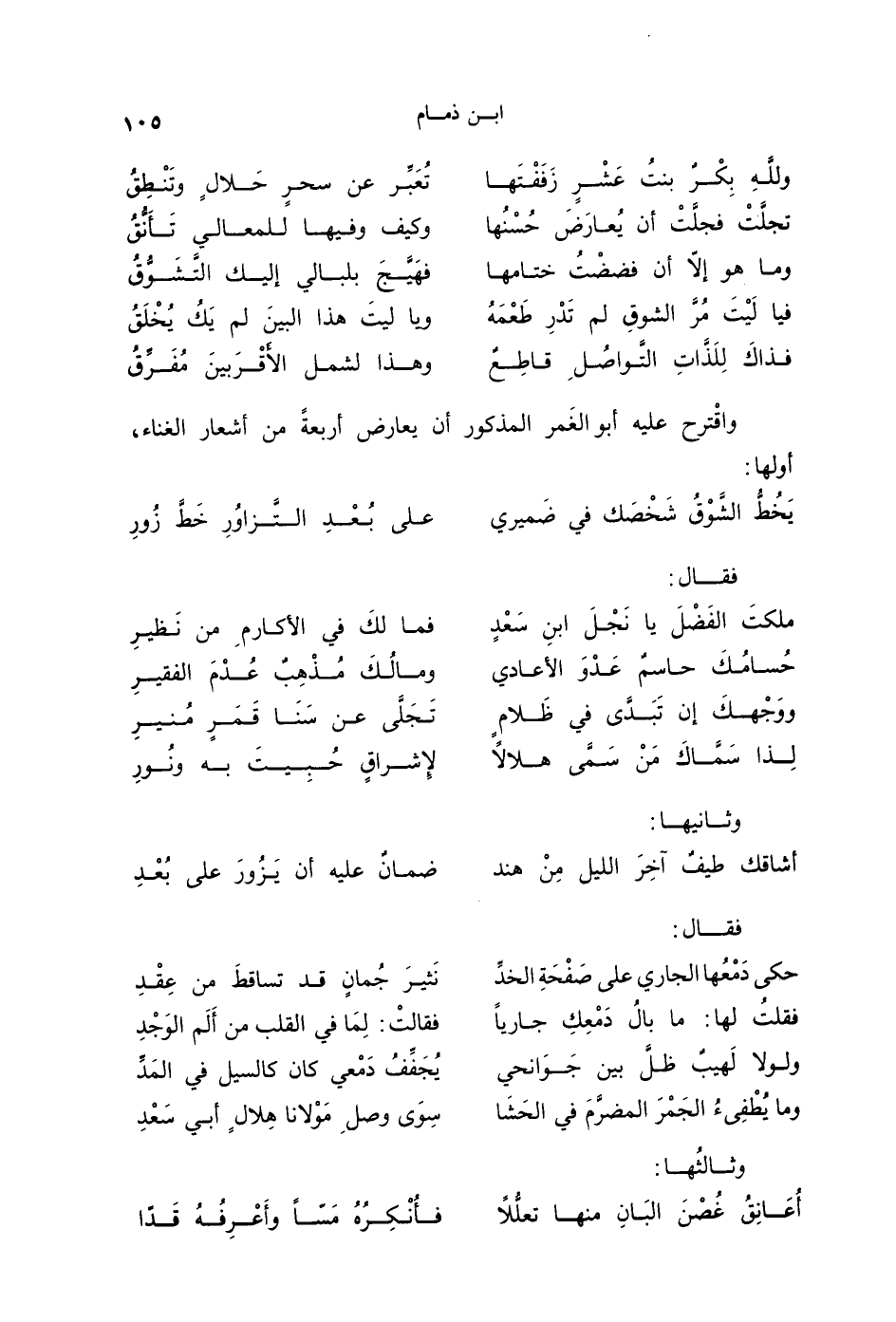 واقترح عليه أبو الغَمر المذكور أن يعارض أربعةً من أشعار الغناء، أولها: