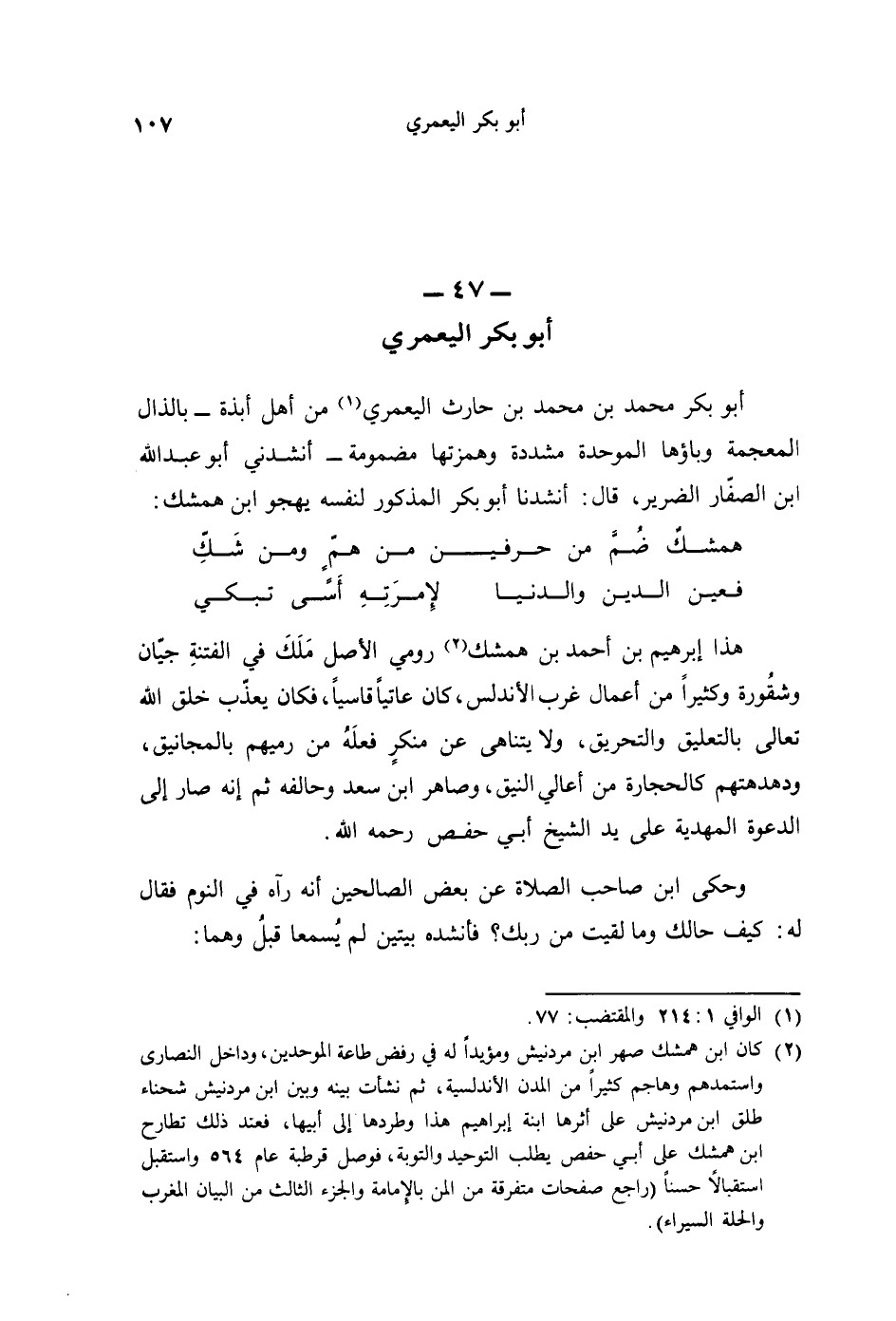 أبو بكر محمد بن محمد بن حارث اليعمري من أهل أبذة - بالذال المعجمة وباؤها الموحدة مشددة وهمزتها مضمونة - أنشدني أبو عبد الله ابن الصفّار الضرير، قال: أنشدنا أبو بكر المذكور لنفسه يهجو ابن همشك: