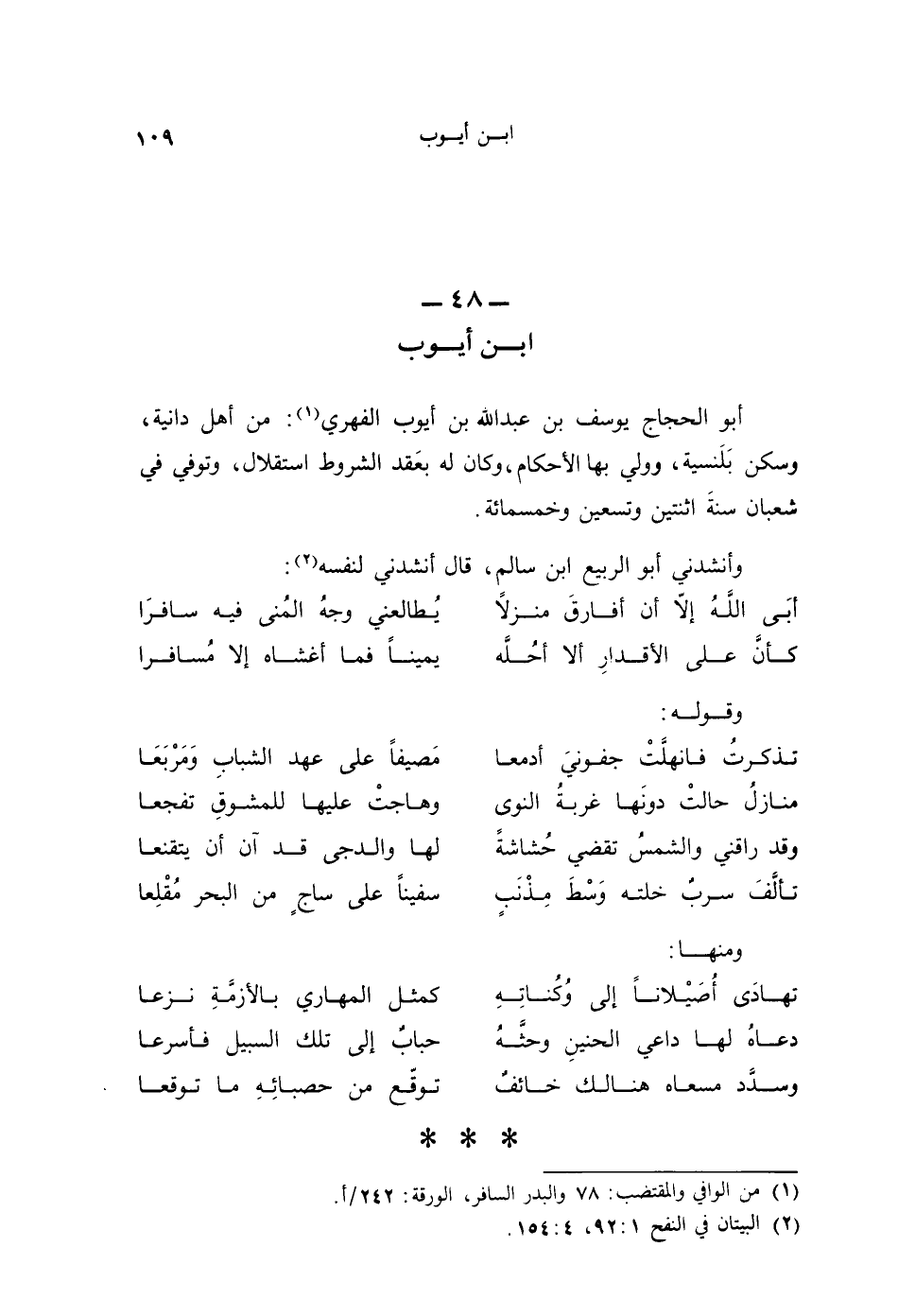 أبو الحجاج يوسف بن عبد الله بن أيوب الفهري: من أهل دانية، وسكن بَلَنسية، وولي بها الأحكام، وكان له بعقد الشروط استقلال، وتوفي في شعبان سنة اثنتين وتسعين وخمسمائة.