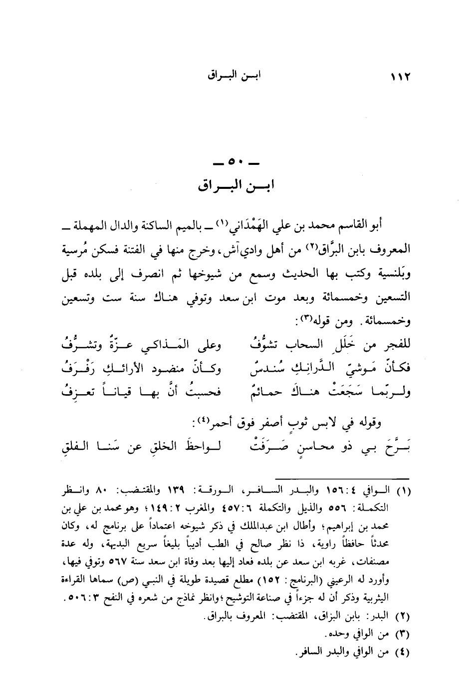 أبو القاسم محمد بن علي الهَمْداني - بالميم الساكنة والدال المهملة - المعروف بابن البرَّاق من أهل وادي آش، وخرج منها في الفتنة فسكن مُرسية وبلنسية وكتب بها الحديث وسمع من شيوخها ثمَّ انصرف إلى بلده قبل التسعين وخمسمائة وبعد موت ابن سعد وتوفي هناك سنة ست وتسعين وخمسمائة. ومن قوله: