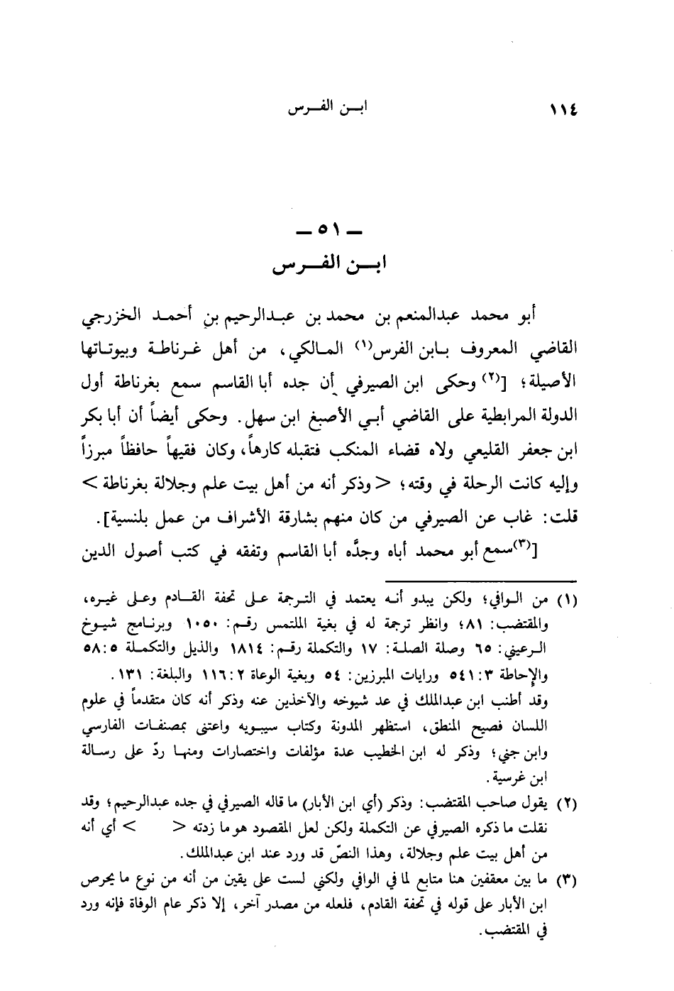 أبو محمد عبد المنعم بن محمد بن عبد الرحيم بن أحمد الخزرجي القاضي المعروف بابن الفرس المالكي، من أهل غرناطة وبيوتاتها الأصيلة؛ وحكى ابن الصيرفي أن جده أبا القاسم سمع بغرناطة أول الدولة المرابطية على القاضي أبي الأصبغ ابن سهل. وحكى أيضاً أن أبا بكر ابن جعفر القليعي ولاه قضاء المنكب فتقبله كارهاً، وكان فقيهاً حافظاً مبرزاً وإليه كانت الرحلة في وقته؛ وذكر أنَّه من أهل بيت علم وجلالة بغرناطة قلت: غاب عن الصيرفي من كان منهم بشارقة الأشراف من عمل بلنسية.
