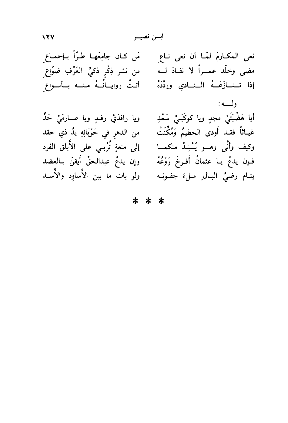 أيا هَضْبَتَيْ مجدٍ ويا كَوكَبَيْ سعدِ ... ويا رافدَيْ رفدٍ ويا صارمَيْ حدِّ