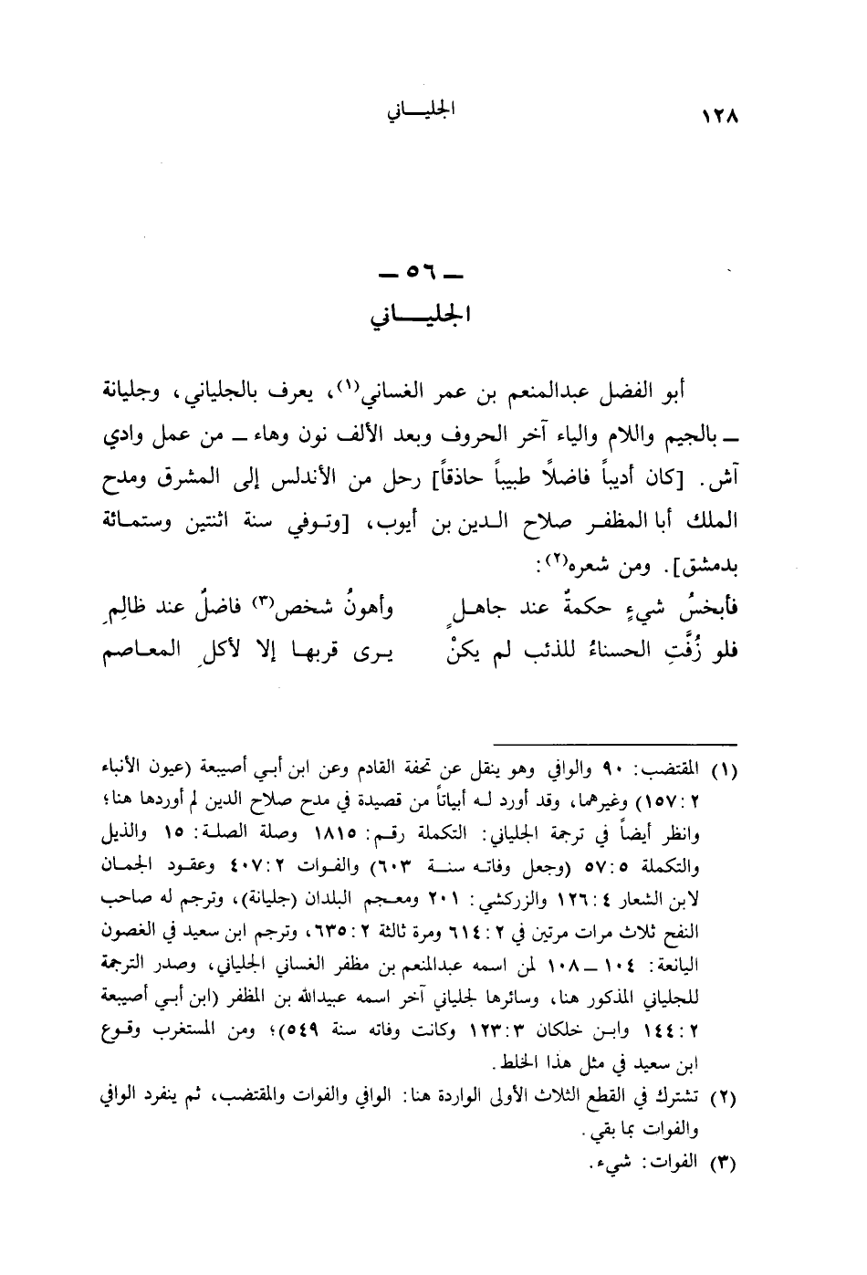 أبو الفضل عبد المنعم بن عمر الغساني، يعرف بالجلياني، وجليانة - بالجيم واللام والياء آخر الحروف وبعد الألف نون وهاء - من عمل وادي آش. كان أديباً فاضلاً طبيباً حاذقاً رحل من الأندلس إلى المشرق ومدح الملك أبا المظفر صلاح الدين بن أيوب، وتوفي سنة اثنتين وستمائة بدمشق. ومن شعره: