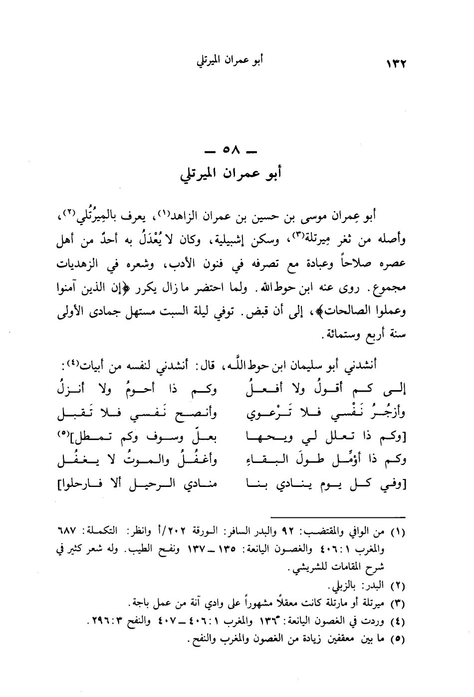 أبو عِمران موسى بن حسين بن عمران الزاهد، يعرف بالمِيرتُلي، وأصله من ثغر مِيرتلة، وسكن إشبيلية، وكان لا يُعدلُ به أحدٌ من أهل عصره صلاحاً وعبادة مع تصرفه في فنون الأدب، وشعره في الزهديات مجموع. روى عنه ابن حوط الله. ولما احتضر ما زال يكرر:) إنَّ الذين آمنوا وعملوا الصالحات (، إلى أن قبض. توفي ليلة السبت مستهل جمادى الأولى سنة أربع وستمائة.