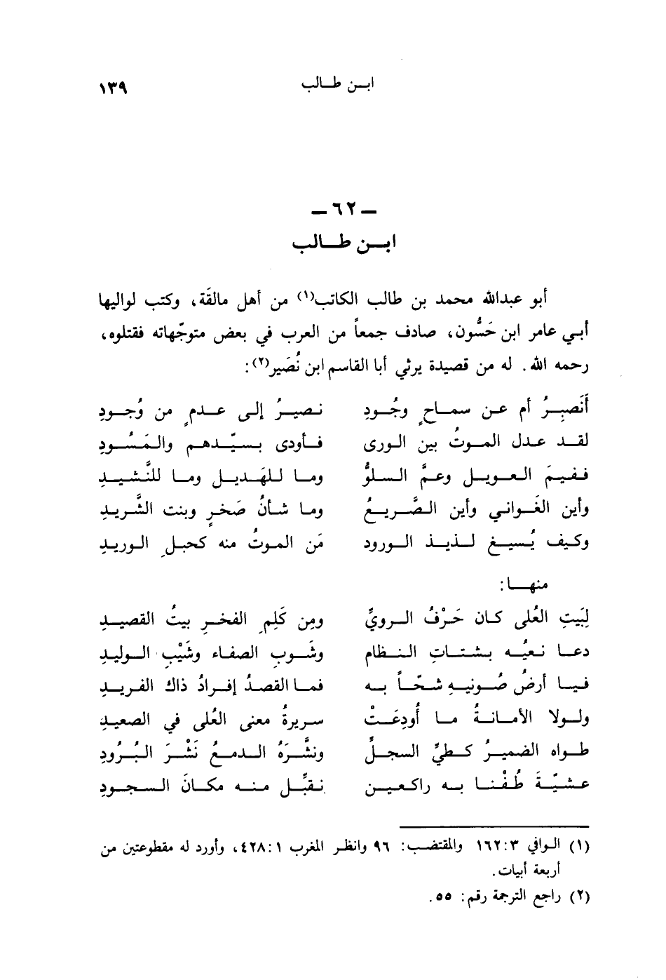 أبو عبد الله محمد بن طالب الكاتب من أهل مالقة، وكتب لواليها أبي عامر ابن حَسُّون، صادف جمعاً من العرب في بعض متوجّهاته فقتلوه، رحمه الله. له من قصيدة يرثي أبا القاسم ابن نُصير: