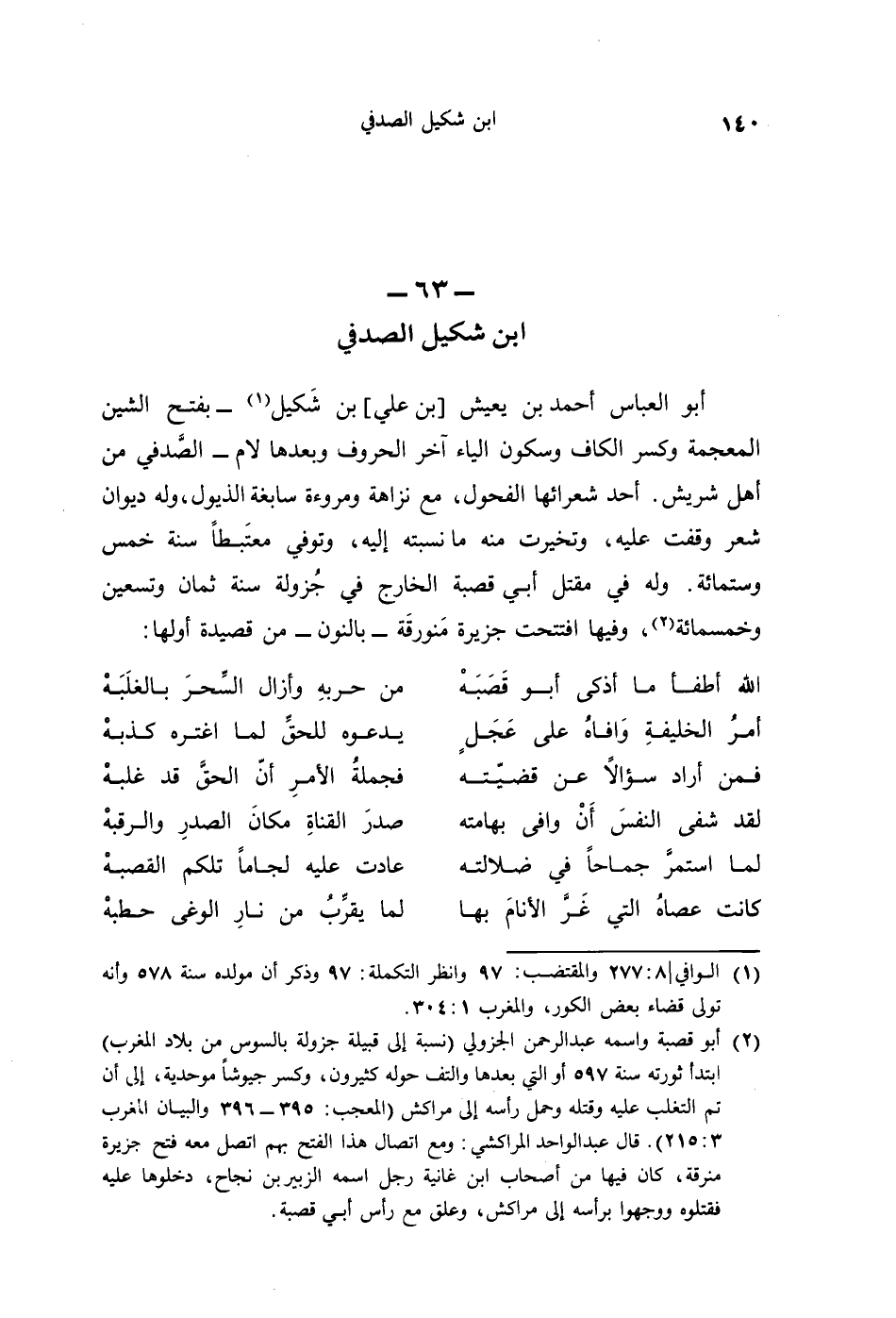 أبو العباس أحمد بن يعيش بن علي بن شَكيل - بفتح الشين المعجمة وكسر الكاف وسكون الياء آخر الحروف وبعدها لام - الصَّدفي من أهل شريش. أحد شعرائها الفحول، مع نزاهة ومروءة سابغة الذيول، وله ديوان شعر وقفت عليه، وتخيرت منه ما نسبته إليه، وتوفي معتَبطاً سنة خمس وستمائة. وله في مقتل أبي قصبة الخارج في جُزولة سنة ثمان وتسعين وخمسمائة، وفيها افتتحت جزيرة مَنورقَة - بالنون - من قصيدة أولها: