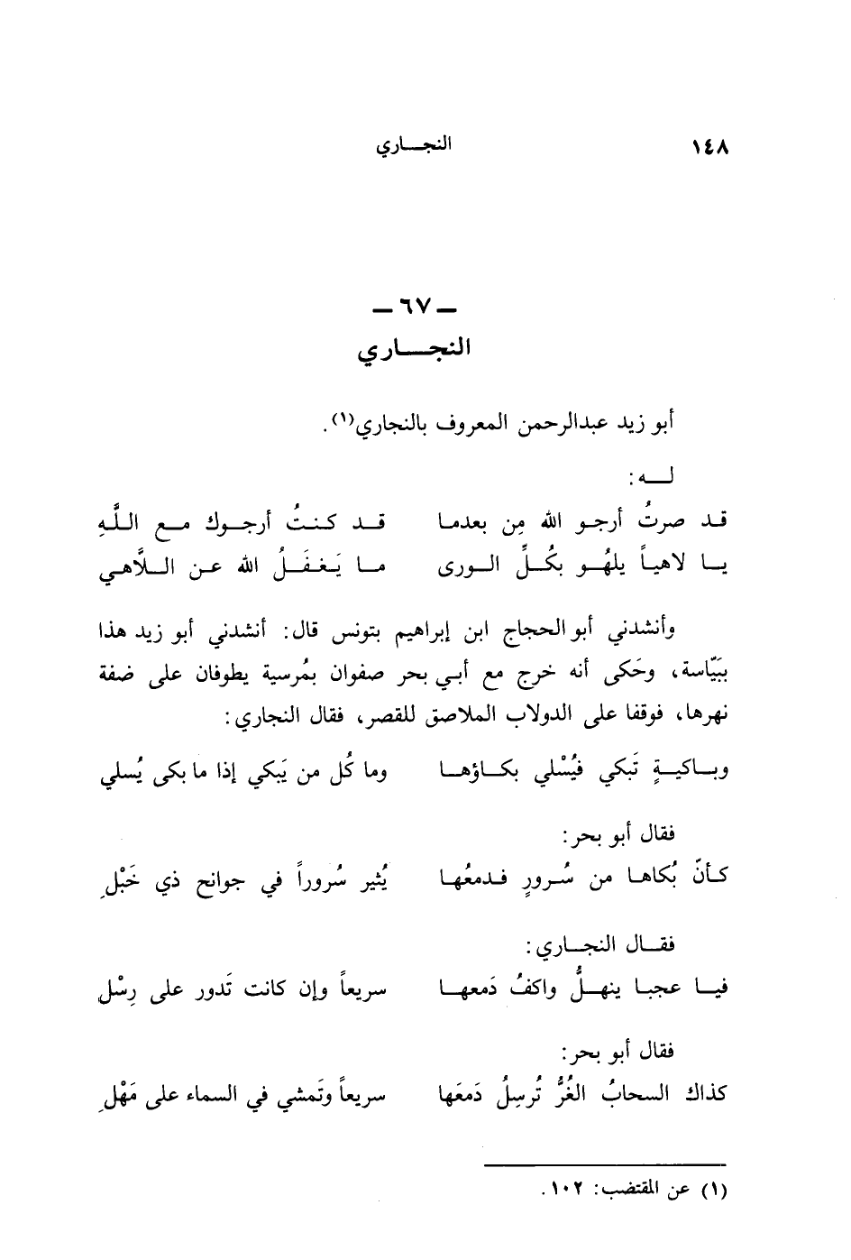 وأنشدني أبو الحجاج ابن إبراهيم بتونس قال: أنشدني أبو زيد هذا ببَيَّاسة، وحكى أنَّه خرج مع أبي بحر صفوان بمُرسية يطوفان على ضفة نهرها، فوقفا على الدولاب الملاصق للقصر، فقال النجاري: