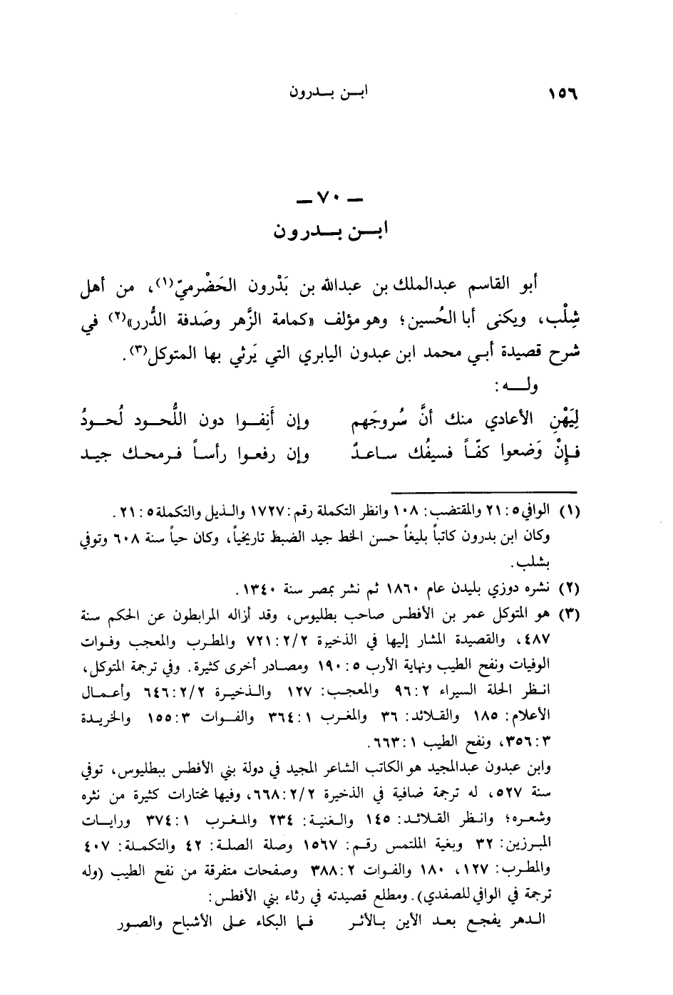أبو القاسم عبد الملك بن بَدْرون الحضرميّ، من أهل شِلْب، ويكنى أبا الحسين؛ وهو مؤلف " كمامة الزَّهر وصَدفة الدُّرر " في شرح قصيدة أبي محمد ابن عبدون اليابري التي يرثي بها المتوكل.