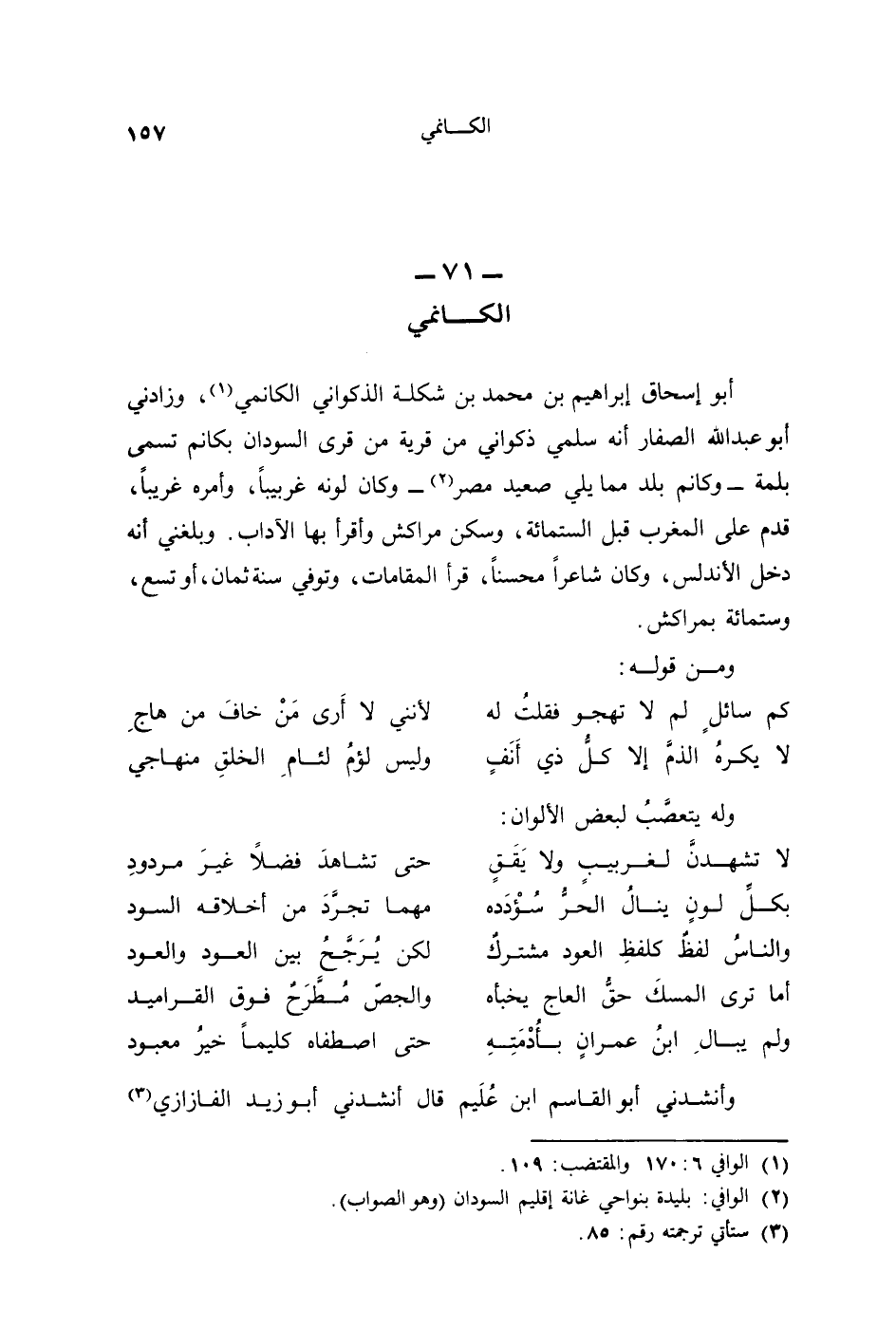 أبو إسحاق إبراهيم بن محمد بن شكلة الذكواني الكانمي، وزادني أبو عبد الله الصفار أنَّه سلمي ذكواني من قرية من قرى السودان بكانم تسمى بلمة - وكانم بلد مما يلي صعيد مصر - وكان لونه غربيباً، وأمره غريباً، قدم على المغرب قبل الستمائة، وسكن مراكش وأقرأ بها الآداب. وبلغني أنَّه دخل الأندلس، وكان شاعراً محسناً، قرأ المقامات، وتوفي سنة ثمان، أو تسع، وستمائة بمراكش.