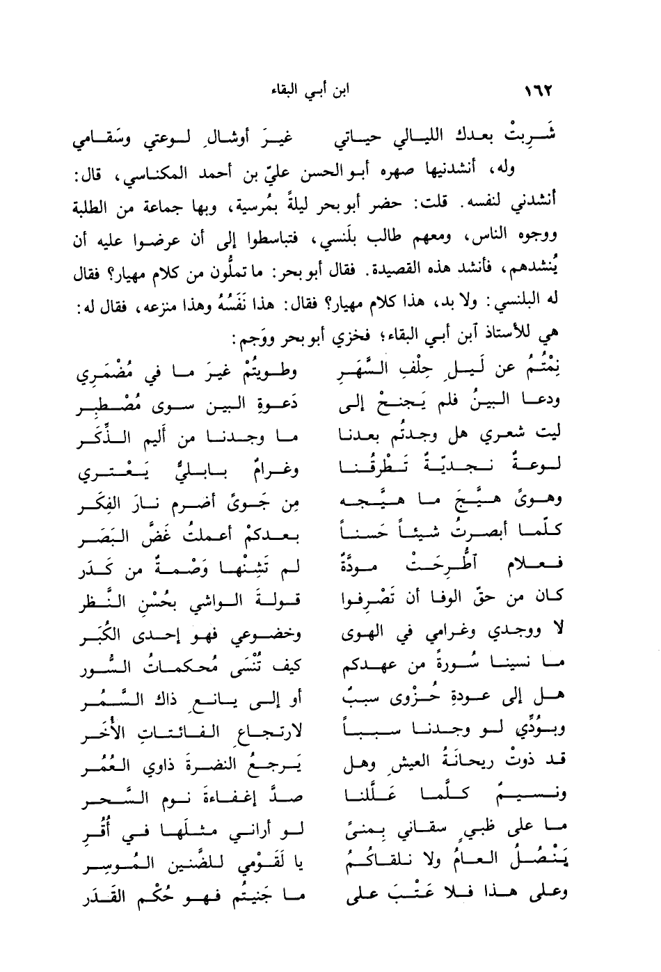 وله، أنشدنيها صهره أبو الحسن عليّ بن أحمد المكناسي، قال: أنشدني لنفسه. قلت: حضر أبو بحر ليلةً بمرسية، وبها جماعة من الطلبة ووجوه الناس، ومعهم طالب بلنسي، فتباسطوا إلى أن عرضوا عليه أن ينشدهم، فأنشد هذه القصيدة. فقال أبو بحر: ما تملُّون من كلام مهيار؟ فقال له البلنسي: ولا بد، هذا كلام مهيار؟ فقال: هذا نفَسُهُ وهذا منزعه، فقال له: هي للأستاذ ابن أبي البقاء؛ فخزي أبو بحر ووجم: